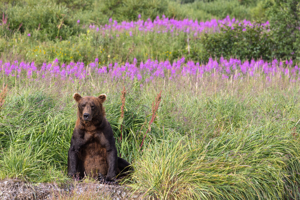 It takes a significant amount of nutrients to satiate a bear, so they continue to spend most of their time eating grasses and berries that are plentiful on Katmai. Physically, the bears maintain their traditional round, fuzzy look. Mothers nurse their cubs, and young bears nuzzle each other and frolic in the meadows. If you want to see bears interacting with each other on dry land, this is a great time to go. July is also the best time to see wildflowers, as the coast blooms with blue and purple lupines, fireweed and wild geranium, and bears gather to graze on the sweet stalks.